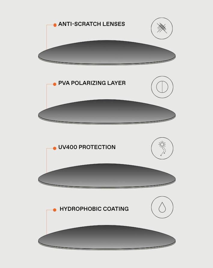 ** Polarized lenses reduce reflections from the sun on various surfaces, minimizing visual fatigue. They are equipped with AntiScratch coating technology, providing an extra layer of protection, improving resistance to heat, humidity, bumps, and scratches. The oleophobic coating layer ensures smoothness, making it difficult for dirt to adhere, and repelling water, oils, and sweat stains, easily wiped off without leaving a trace.